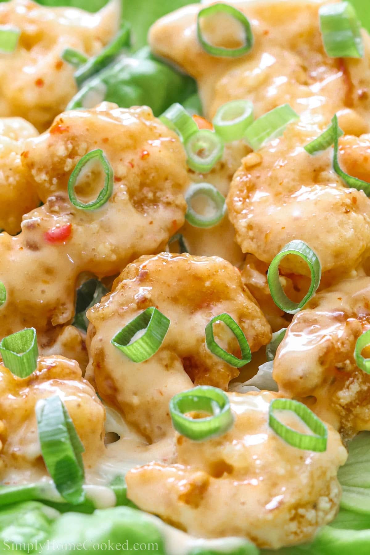 Place the fried shrimp in the bang bang shrimp sauce on top of the butter lettuce. Garnish with chopped green onions and enjoy.