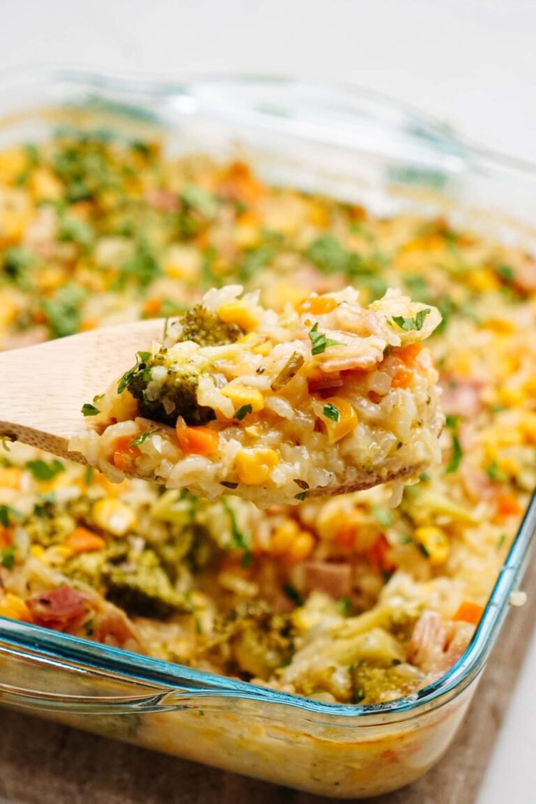 Ham – diced deriham or the rest of the holiday ham both work well here. Cream of chicken soup – classic binder. Can be exchanged for mushrooms and celery cream. Chicken Stock – Add flavor. Water works in a pinch. Onion, carrot, corn, broccoli – all vegetables in this casserole. Now, if you don’t have one big carrot or happen to have corn ears in your hand, don’t sweat it. Use what you have! The vegetables will be tasty.