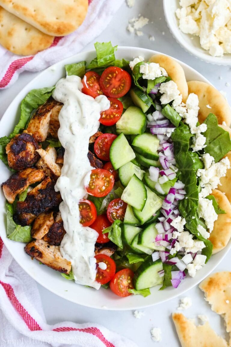 Preheat the grill. Heat the grill to medium height or approximately 400 degrees Fahrenheit. Clean and oil the grille great. Grill and assemble. Bake the chicken on one side for about 5-7 minutes. Please rest for about 5 minutes. Next, chopped chicken into bite-sized pieces and served on a bed of chopped romaine lettuce and add toppings such as red onions, tomatoes, cucumbers, Greek yogurt sauce/tuzajiki, feta cheese, mini pita bread and more.