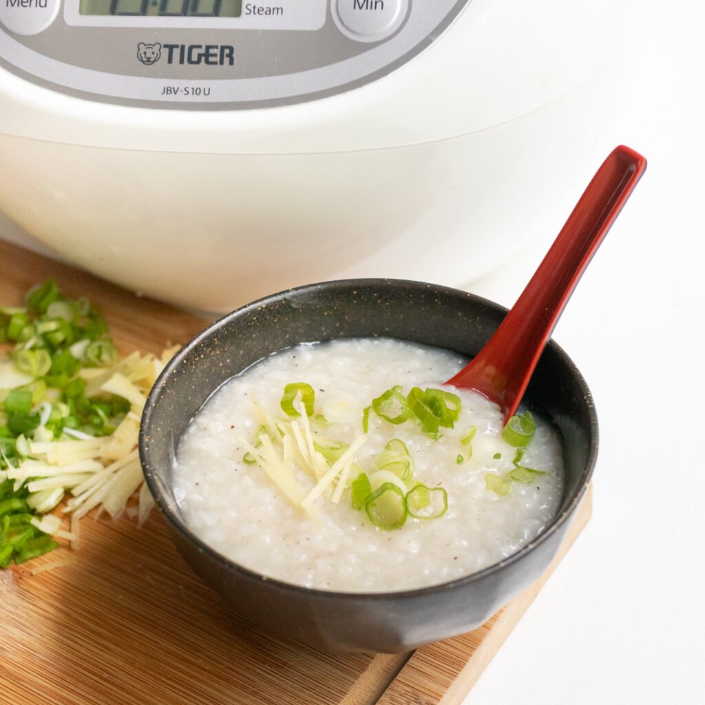 Preparing and starting the porridge: Mix unwashed rice and water in the pot of the rice cooker. Close the lid and start the regular rice cooker setting (I use the “plain” setting on my Costco Tiger rice cooker, which takes about an hour).