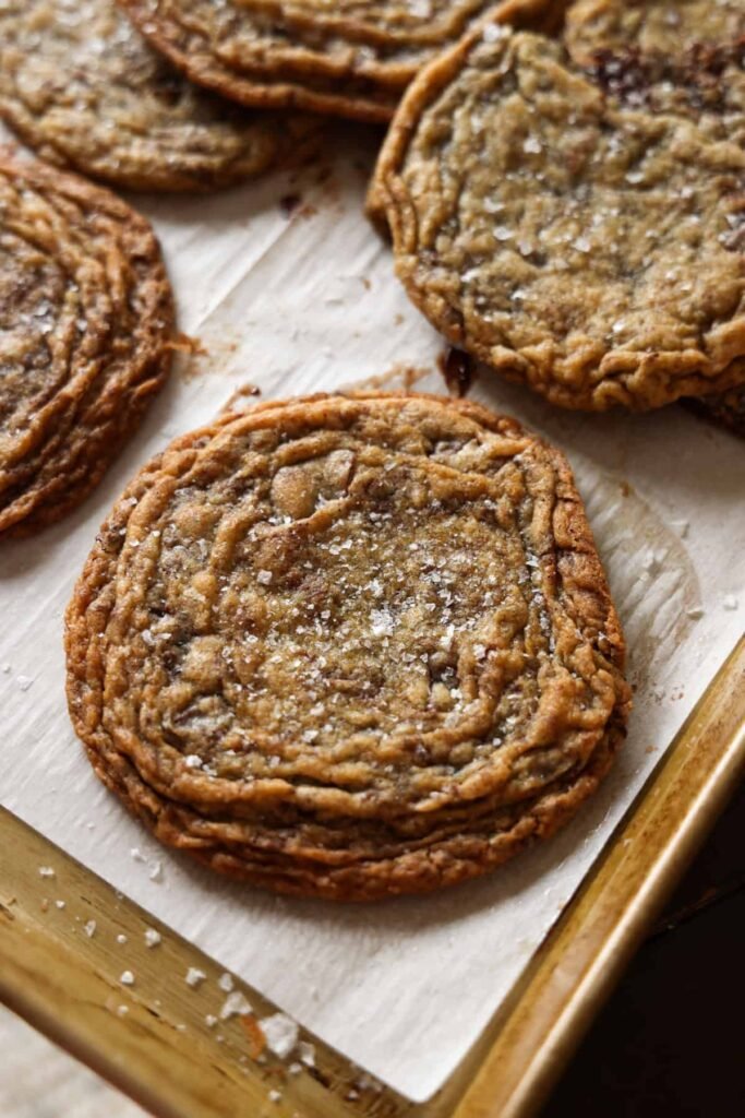 Cold is important. 15 minutes will help control the spread. However, do not let it cool for more than 15 minutes. Chilling for too long will cause the cookies to wrinkle (slap) around the edges, which will prevent them from baking and spreading evenly. Use chopped chocolate instead of chips. It melts into puddles all over the cookie and pairs well with the thin texture of the cookie. Do not overcook. When you pull it out, it should look like there’s just a little bit left in the center. It will solidify as it cools. Give them space. 4 pieces per baking sheet is ideal for proper spreading. If you stuff it into a pan, it will definitely bake together. This isn’t the worst thing, but that’s not the goal here.