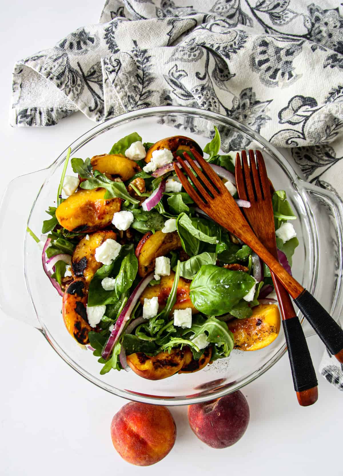 A delicious grilled peach salad made with fresh and juicy summer peaches. With sweet, smoky grilled peaches, peppery arugula, creamy feta, and crunchy toasted walnuts, this beautiful salad has all the ingredients you need for the perfect summer salad. A tangy maple Dijon vinaigrette brings everything together.
