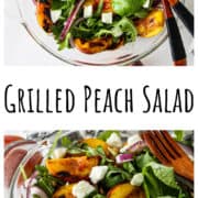 A delicious grilled peach salad made with fresh and juicy summer peaches. With sweet, smoky grilled peaches, peppery arugula, creamy feta, and crunchy toasted walnuts, this beautiful salad has all the ingredients you need for the perfect summer salad. A tangy maple Dijon vinaigrette brings everything together.