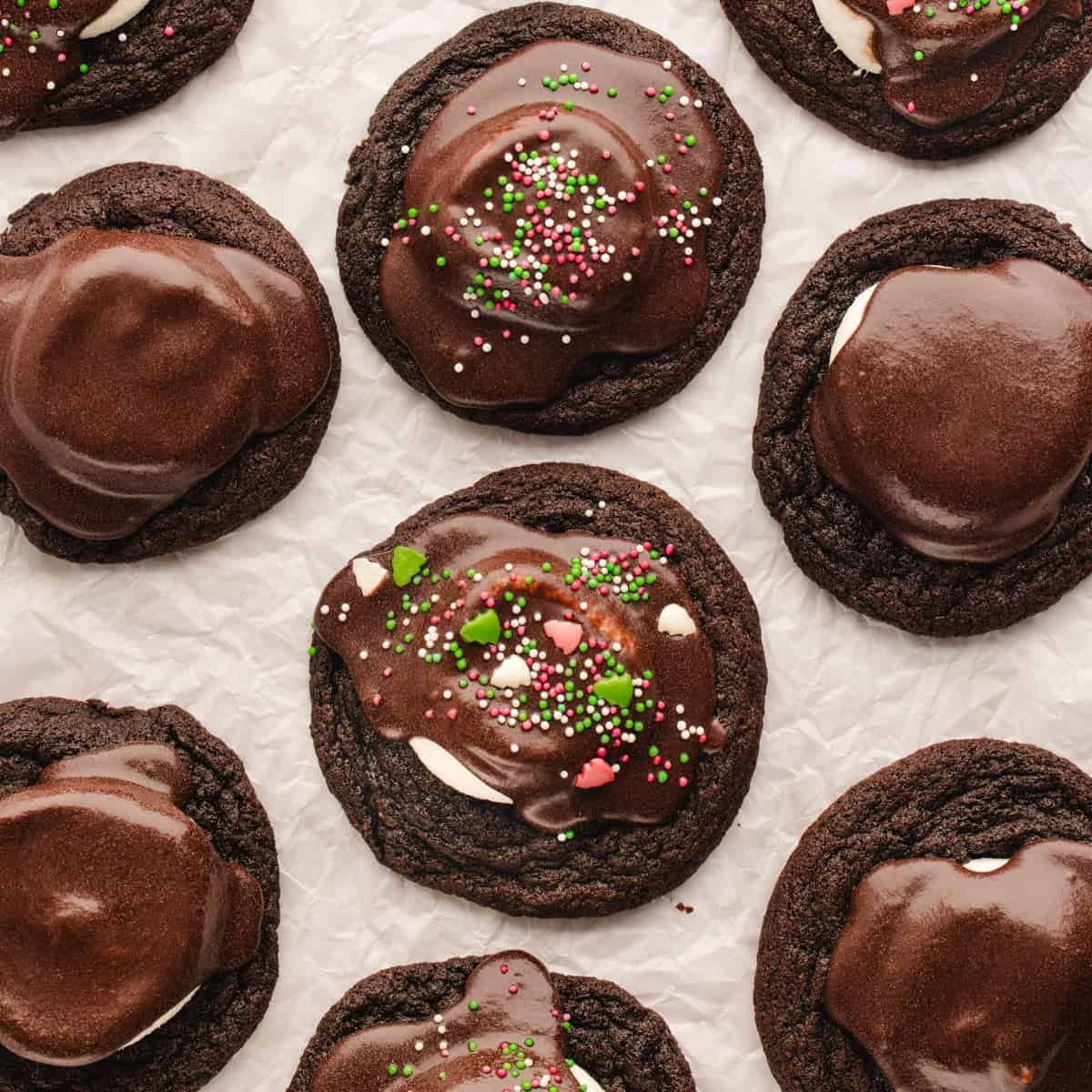 Chilling the dough is essential as it prevents the cookies from spreading too much and ensures a soft, puffy center that can support the marshmallow topping. Cutting each marshmallow in half will help it melt evenly throughout the cookie without sliding around. The texture of the chocolate glaze is glossy, smooth, and rich without being heavy. Add some festive sprinkles to some (or all) of your cookies to make them look even more Christmas-y. Let the glazed cookies stand at room temperature until completely set and stack neatly without messing.