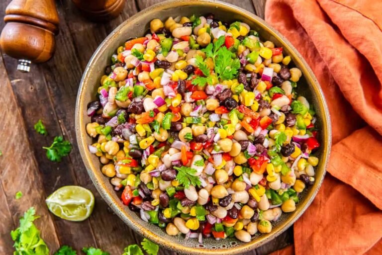 This lively Mexican bean salad is a fresh and enthusiastic side dish perfect for potlucks, barbecue or for a quick meal preparation. It’s as flavorful as it’s versatile, as it’s a colorful mix of beans, corn and peppers thrown in a tangy dressing.