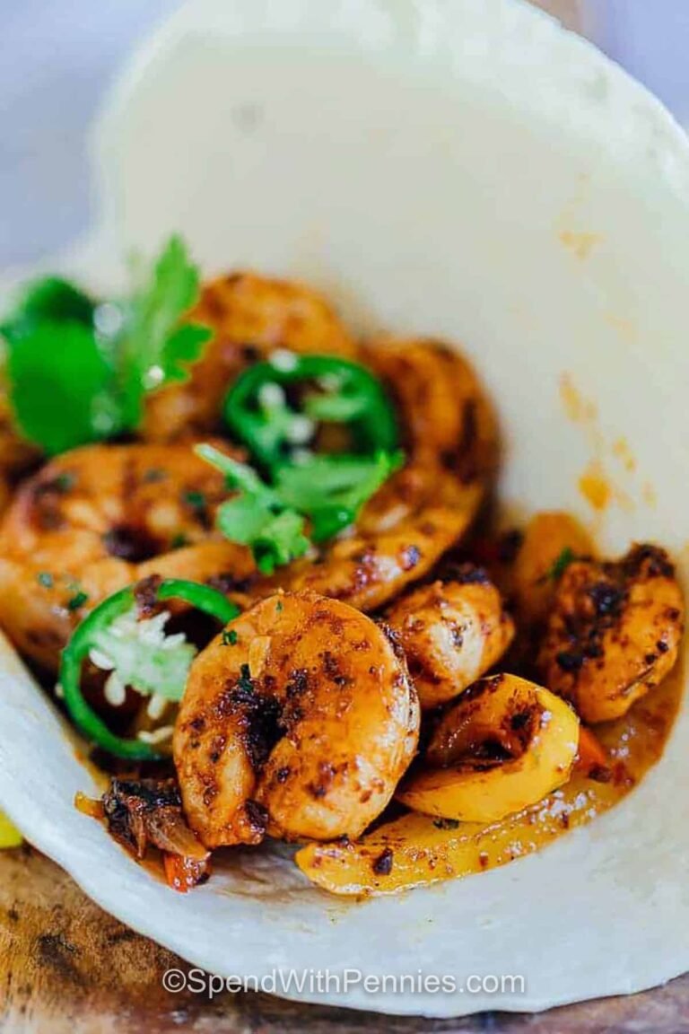 Juicy shrimp, tender onions and sweet peppers are fried with southwestern spices and tucked into a warm tortilla with your favorite toppings for the perfect weekday meal.
