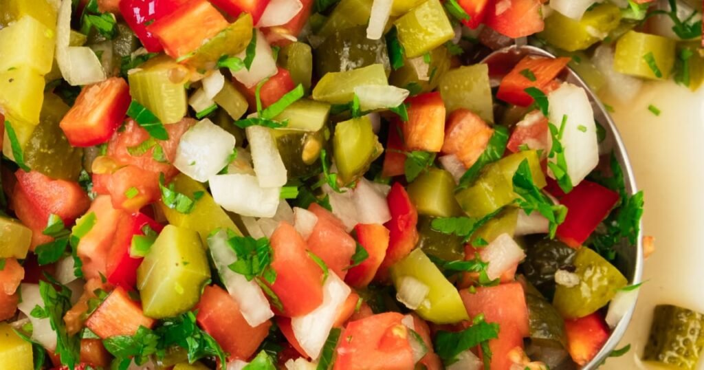 Dill pickles: Choose classic dill, which isn’t too sweet. The purpose of cutting into small cubes here is to emphasize texture. Roma tomatoes: low moisture and strong structure. The seeds remain intact. Yellow onions: Sharp, but balanced when mixed and cooled. Red bell pepper: Adds sweetness and crunch without being overpowering. Jalapeno: Add seeds to adjust heat. Add more if you like excitement. Fresh cilantro: Bright and fresh, only skip this if absolutely necessary. Pickle brine: The secret weapon for depth and acidity.