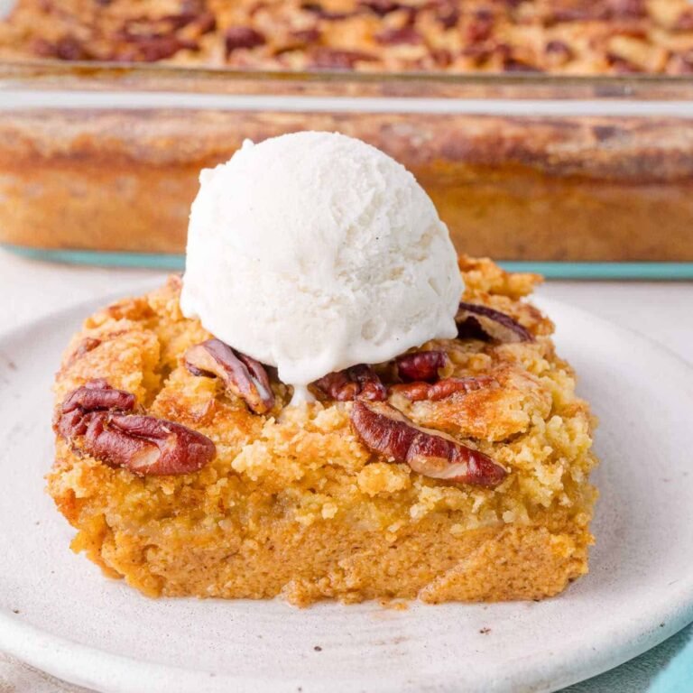 Use pumpkin pie spices. I like to customize the flavor using a spice blend, but if you want to streamline the process, you can use pumpkin pie spices instead. Instead of cinnamon, ginger, nutmeg and cloves, use 2 teaspoons of pumpkin pie spice. Make it gluten-free. Use gluten-free cake mix to make this recipe suitable for people with gluten sensitivity or allergies. Get creative with custard. Butternut squash puree also works with the custard layer, and you can’t even taste the difference. In fact, most canned “pumpkin” purees are actually made from a special type of squash, rather than an actual pumpkin. If you are using homemade pumpkin puree or butternut squash puree, we recommend straining it in a cheesecloth-lined colander or mesh strainer for 30 minutes to remove any excess liquid. It should be the same consistency as canned pumpkins.