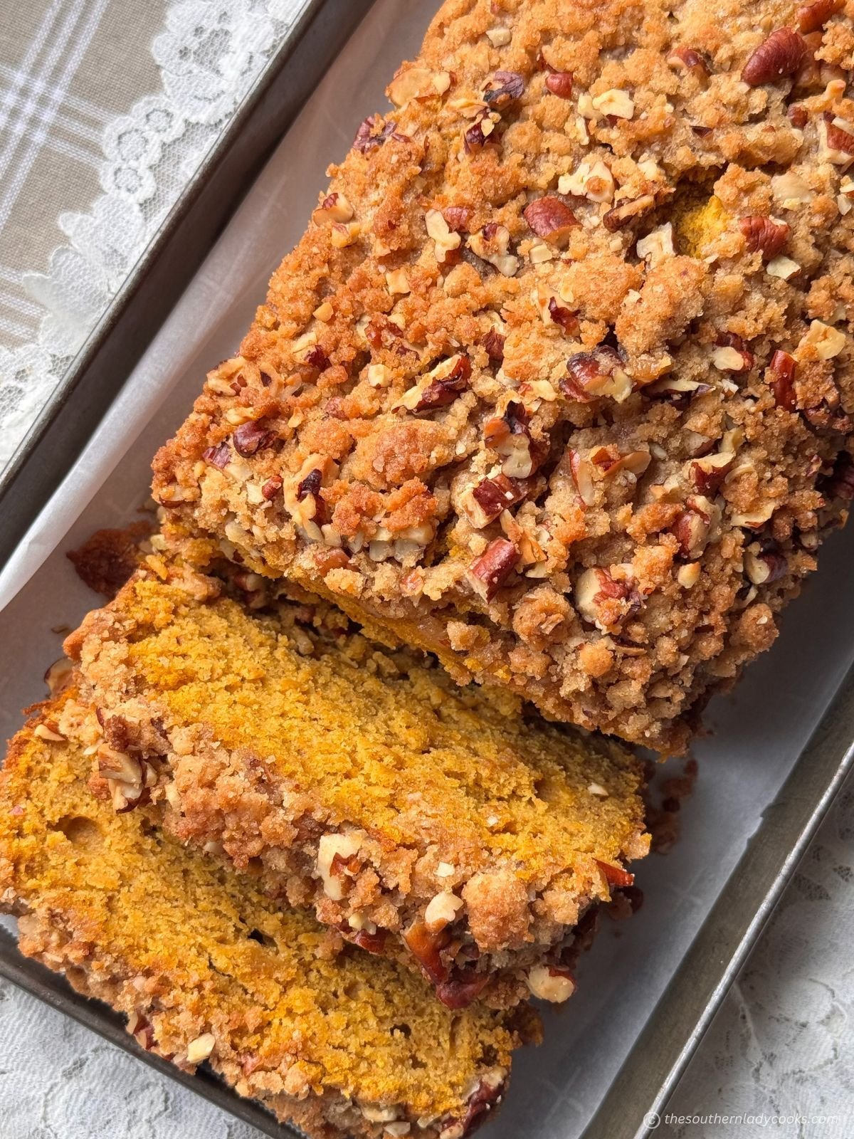 I recently remade this bread and used parchment in the pan. It was an easy way to remove bread from the bread in one hand. It worked perfectly. This Blair has also risen quite a bit, but it didn’t run away at all. This is made with 100% pumpkin puree, not a pumpkin mix. Make sure you get the right kind. One important part of this recipe is to put Streusel toppings in the fridge and point them in the direction.