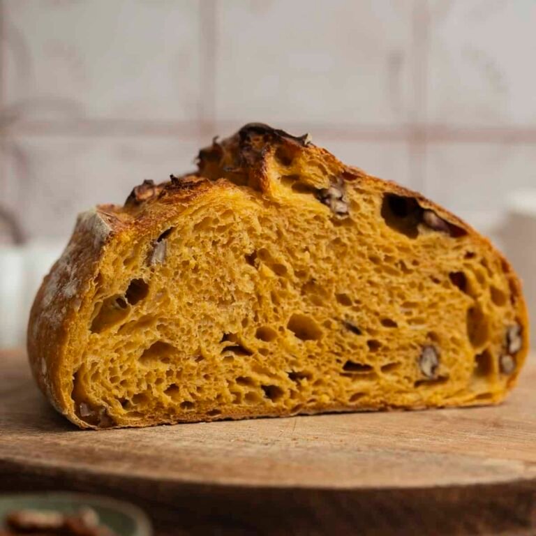 This pumpkin sourdough bread is soft, golden, and gently sweet. The pumpkin puree gives the dough a beautiful color and soft crumb, while the sourdough adds flavor and chew. Dotted with crunchy pecans. This bread is perfect toasted with butter, spread with cinnamon cream cheese, or served with soup.