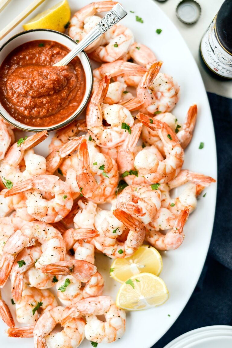 Our roasted shrimp platter with homemade cocktail sauce is a hit at any party. Roast the shrimp in olive oil, season with salt, pepper and a squeeze of lemon juice fresh from the oven. My homemade cocktail sauce is more than just horseradish and ketchup. It’s very delicious and a perfect appetizer for New Year’s Eve.