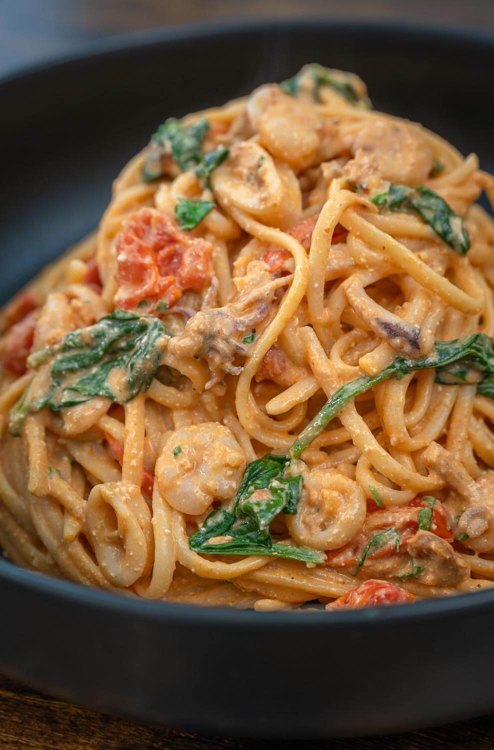 Seafood Aligue Pasta is a combination of two things Filipinos love: pasta and Aligue. This Seafood Aligue Pasta recipe combines classic Aligue pasta with plenty of seafood mix, grape tomatoes, and baby spinach for a complete meal. Seafood Aligue Pasta is perfect for lunch or dinner, and the combination of crab fat, ricotta, and Parmesan creates a sauce that clings to each strand of linguine. I’ve been making Seafood Alligator Pasta for years and my family asks for it on special occasions.
