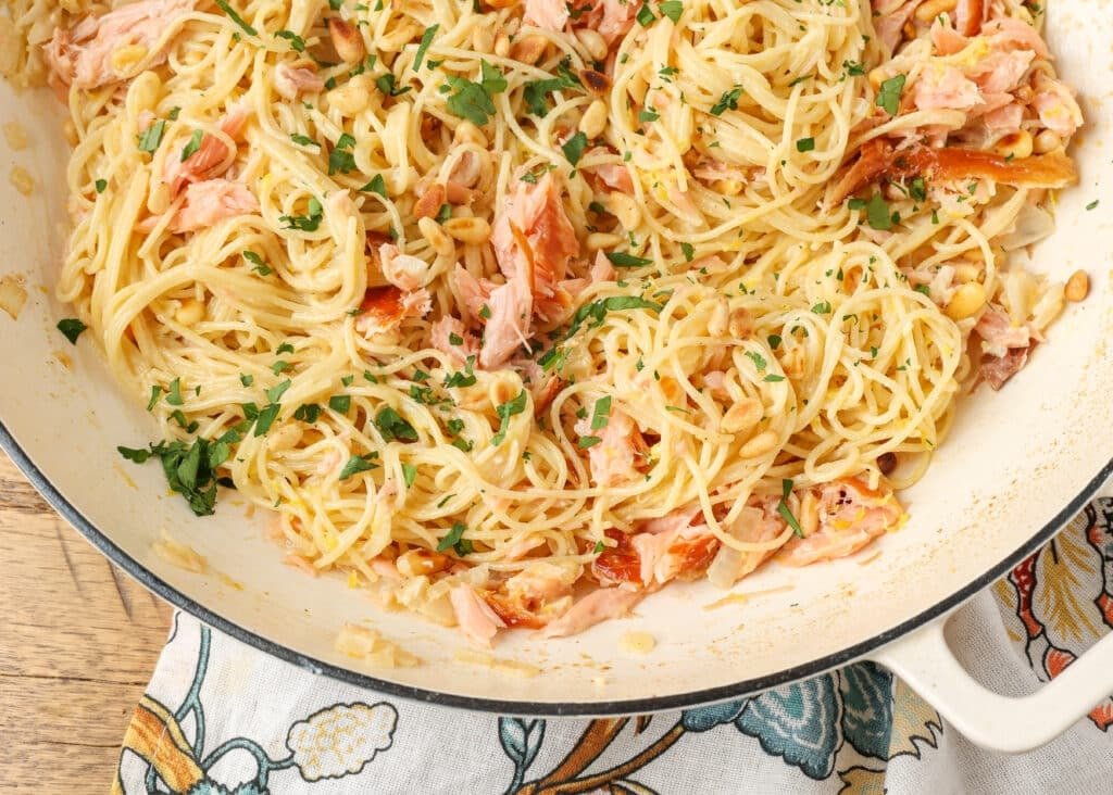 This pasta is in a bowl, like in spring or summer. It’s light and lemony that balances the flavors. The lemon passes through creaminess, the salmon brings a bit of smoky depth, and the pine nuts add just the right crunch.