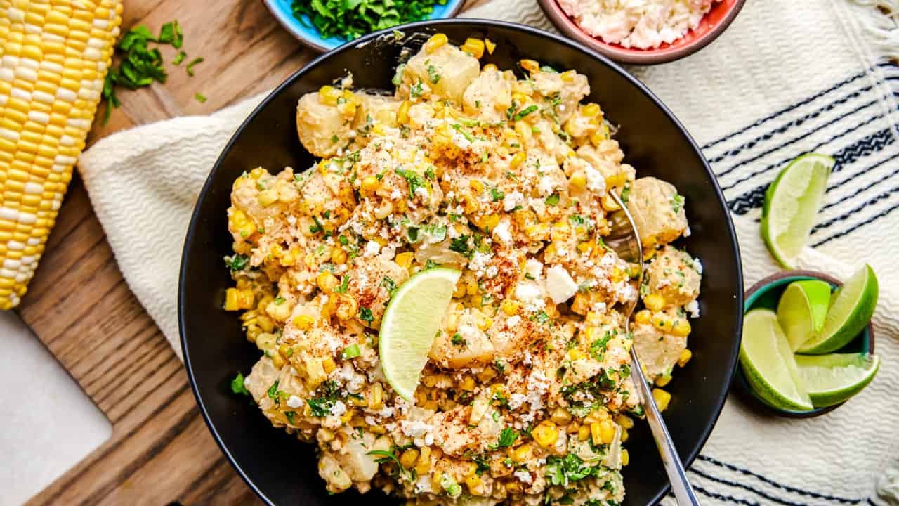 The flavor of Mexican street corn has been transformed into a potato salad! The burnt corn adds a little extra flavor. Use frozen or cut straight from the cob. Add vinegar while the potatoes are still hot to absorb the flavor.