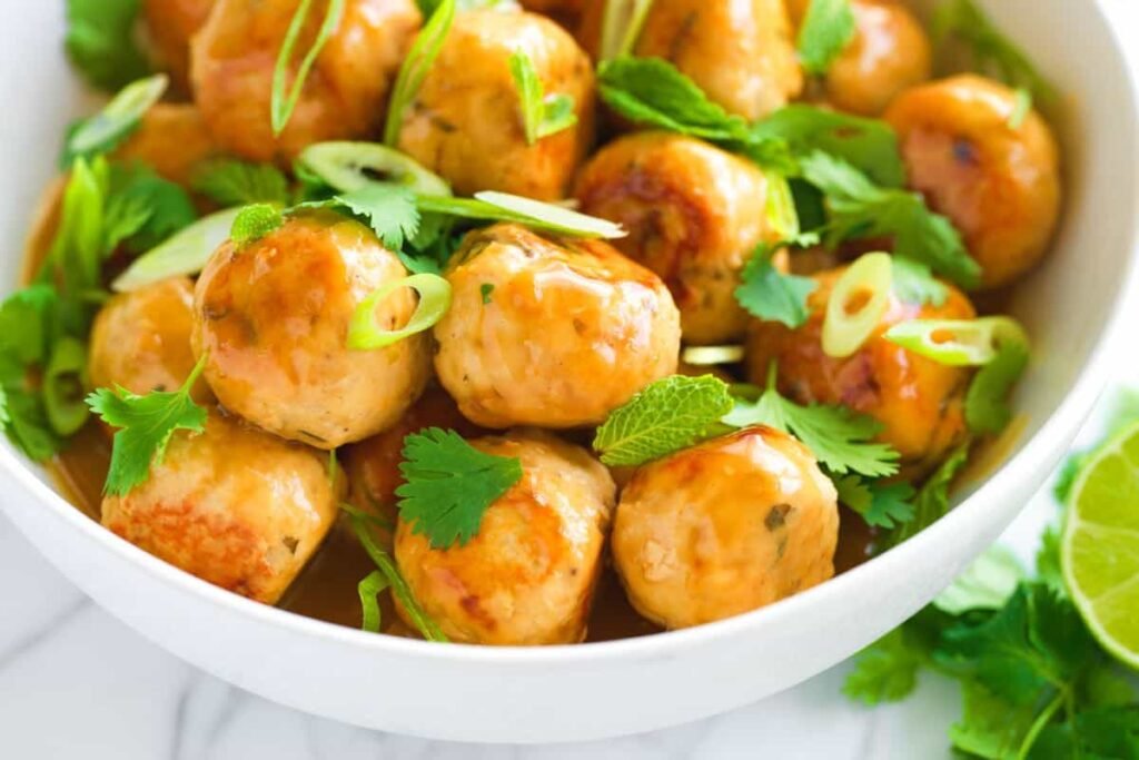 Ground chicken: Look for fat ground chicken (92/8 or near it is perfect). Skip slimmer options. It just gives you tough and dry meatballs. I use the same trick on classic meatballs too! Pork and turkey are also excellent. Coconut Milk: This recipe requires full-fat coconut milk. When you’re in the store, hear that you flip the can. You should not hear much sloshing fluid. That means there’s a considerable amount of thick coconut cream inside. This is exactly what we want! Don’t shook it when you get home. Cream and milk are required to separate. “Stolen” two tablespoons of that thick cream for the meatball mixture. Ginger, Garlic, Lemon Graspatto: These are our aromatics (I love the combination). Fresh lemongrass is a bit tedious to prepare, so I usually go to Lemongrass Stamp in a tube (it’s great for the red curry paste too). If you can’t find the paste, don’t worry. We have included instructions on how to prepare fresh lemongrass in the tips section below the recipe. Add these fresh herbs to both meatballs and sauce: Green Onion, Basil, Mint. It makes the taste of this dish very lively and fresh. I love Thai basil for this, but with any variety! Brown Sugar: This brings “sweet” to our sweet, sour sauces, balanced with sourness. Brown sugar works very well with aromatic and fish sauces. Coconut sugar would also be a great alternative here if you like. Lime and Rice Vinegar: These are the “sour” elements of the sauce! Use unsweetened rice wine vinegar and fresh lime (used for maximum sour use of both the skin and juice). China 5 Spices: Add just a little (1/4 tsp) to the meatball mixture. I love it, but if you don’t want to buy an all-new spice jar for just a small teaspoon, you can use the same amount of garam masala. Or try Grand Allspice. However, instead, reduce it to 1/8 teaspoon. Fish Sauce: Ah, I love the fish sauce! As you might have seen in Vietnamese pho, sesame ginger shrimp marinated or Thai chicken salad recipes, it adds an incredibly salty, umami, and a slightly funky flavour that can’t be replicated. I always have a red boat and three crabs in the pantry (both are excellent choices for this dish). Chicken Soup: Grab a homemade chicken soup you bought from your favorite store or buy. The vegetable soup also works perfectly well here too. You only need a small amount to blend with coconut milk to make the sauce.