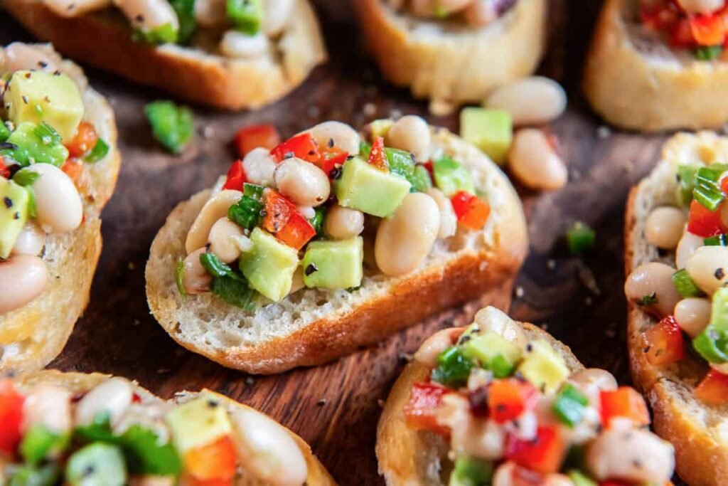 This white bean crostini appetizer is a flavourful mix of creamy white beans, smoky black-eyed peas and avocado, tossed in a citrus sweet dressing. Fresh and healthy options for any gathering.
